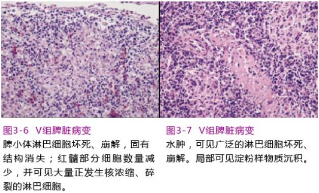 肺、脾、肝有出血点,卵泡充血、出血和变性,偶见胰腺出血和坏死,部分鸭只盲肠内容物呈现污绿色或者黑色,较臭。